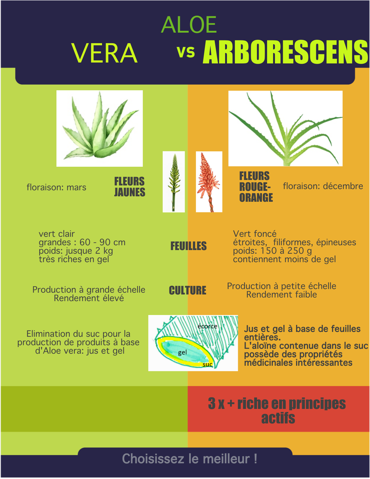 L’Aloe arborescens a pourtant une concentration en principes actifs bien supérieure à celle de l’Aloe vera. Les produits à base d’Aloe arborescens sont élaborés en utilisant la feuille entière, contrairement à la majorité des produits à base d’Aloe vera desquels on retire le suc (la partie qui se trouve entre le gel interne et la partie externe de la feuille) qui contient lui aussi des principes actifs intéressants.